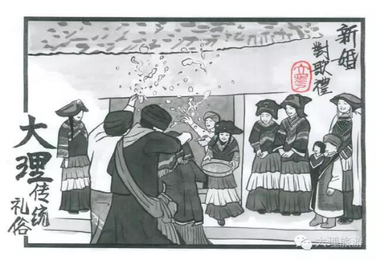 進(jìn)新郎家時,新郎和新娘會對歌,新郎問新娘答,男女雙方一問一答,對歌后,方能入門。