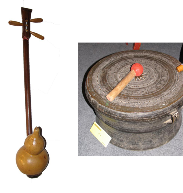 毛南族的歌舞比較簡(jiǎn)單,樂(lè)器也不多,主要伴奏樂(lè)器有長(zhǎng)鼓(也叫黃泥鼓、祥鼓)、木鼓、手鼓、铓鑼、小銅鑼,另外有時(shí)還用到鈸、木魚(yú)和碰鈴,古時(shí)還用嗩吶、簫、笛等(左圖為毛南族葫蘆琴)。