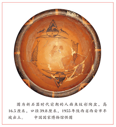 在中國國家博物館的展廳中,既有陜西半坡出土的人面魚紋彩陶盆、陜西華州區(qū)出土的鷹形陶鼎、河南賈湖出土的七孔骨笛、內(nèi)蒙古翁牛特旗出土的紅山玉龍、甘肅出土的馬家窯文化渦紋四系彩陶罐,也有山西襄汾陶寺出土的陶壺、浙江良渚出土的雙鼻陶壺、四川廣漢三星堆出土的青銅面具……