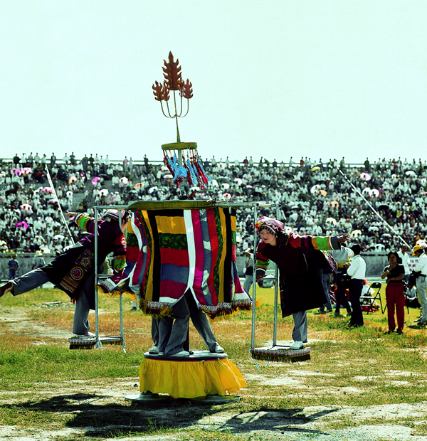 輪子秋,土語(yǔ)稱“卜日熱”,是土族人在農(nóng)閑時(shí)舉行的一種體育活動(dòng),主要在青海互助土族一帶流行。每年冬季碾完場(chǎng)后,特別是春節(jié)期間,人們?cè)谄秸麑挸ǖ柠湀?chǎng)或其他可以利用的場(chǎng)地上,把馬拉大車的車棚卸下來(lái),將輪和軸整體豎起,然后將抵在地上的輪上壓上石頭等重物,固定重心。隨后,在上面的輪子上橫著綁一架三四米長(zhǎng)的梯子,兩端各綁一個(gè)U形的秋千坐套。人坐在坐套內(nèi),由他人推動(dòng)轉(zhuǎn)圈。現(xiàn)在許多土族村莊,每年還要舉行輪子秋比賽。比賽時(shí),兩人各坐于座套上,然后推動(dòng)木梯,使之快速轉(zhuǎn)動(dòng)。參賽者可表演“雄鷹展翅”“金雞獨(dú)立”“孔雀開(kāi)屏”“猛虎下山”“金鐘倒掛”“蛟龍出?!钡润@險(xiǎn)的高難度空中動(dòng)作。比賽常以轉(zhuǎn)時(shí)長(zhǎng)、頭不暈、眼不花、站立較穩(wěn)當(dāng)?shù)霓D(zhuǎn)秋者為優(yōu)勝者。近年來(lái),輪子秋已被列為全國(guó)農(nóng)民運(yùn)動(dòng)會(huì)和民族運(yùn)動(dòng)會(huì)的表演或比賽項(xiàng)目。輪子秋也得到改進(jìn),現(xiàn)多用鋼管為原料焊接,還裝上了滾珠軸承,使用更加安全。